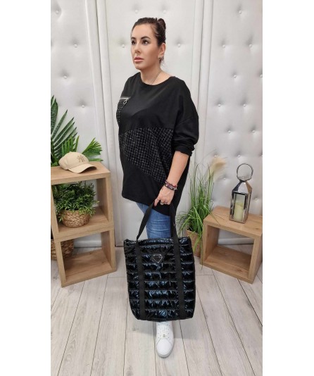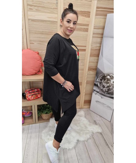 Tunika oversizowa z rękawem 3/4 stanowi świetną podstawę do wielu codziennych stylizacji. Krój jest asymetryczny, a aplikacja z przodu nadaje całości oryginalności. Bez wątpienia niebanalnie zaprezentuje się z woskowanymi spodniami i ciężkimi butami.