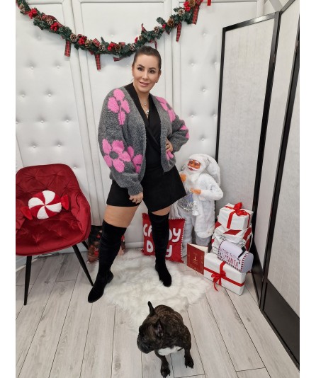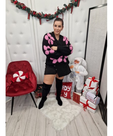 Oversizowy kardigan wyróżnia się kontrastowymi kwiatkami polskiej produkcji Lamu. Model jest niezapinany na guziki posiada kobiecy dekolt w serek, a rękawy i dół wykończone zostały ściągaczami. Idealne od rozmiaru 42 do 50.