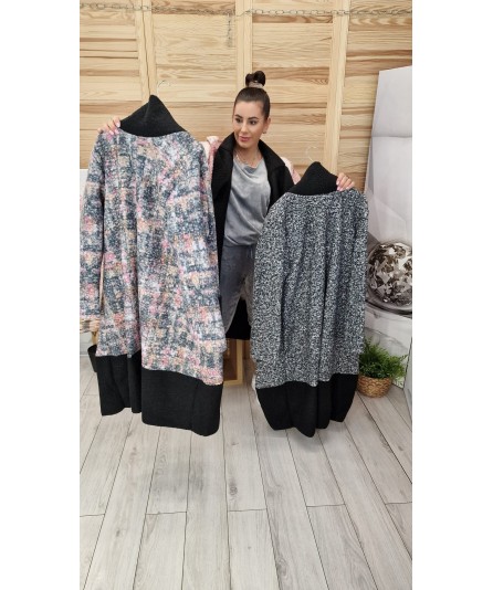 Narzutka- płaszczyk wykonany z bardzo modnego i przyjemnego materiału bukla. Idealny i ciepły na chłodniejsze dni jesienne. Luźny, oversizowy krój, który pasuje do stylizacji eleganckich, casualowych jak i sportowych. Model niezapinany, typu waterfall. Falbana dolna, kołnierz i kieszenie uszyte z czarnej kontrastowej bukli.