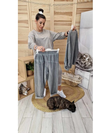 Model posiada bufiaste ściągacze na rękawach i lekko zwężane nogawki. W pasie znajduje się gumka z ozdobnym sznureczkiem