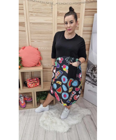 Cudowny model sukienki, która łączy w sobie bawełnianą górę z oprintowanym dołem. Modne printy dodają uroku oraz odmładzają. Pasuje do ubioru na codzień do trampek oraz botków. Uciągliwy materiał sprawia że sukienka dopasowuje się do każdego biustu.