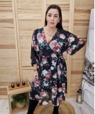 Zwiewna sukienka we wzory to opcja, która doskonale sprawdzi się na różne okazje. Posiada kobiecy, kopertowy dekolt oraz wiązany ściągacz w pasie. Długie rękawy zostały elasycznymi gumkami, które nadają całości dziewczęcego looku.