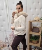 Kaptur obszyty odpinanym liskiem, zakończony troczkami z pomponami.