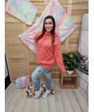 Luźny sweter uszyty z miękkiej, przyjemnej w dotyku dzianiny. Model posiada kaptur ze ściągaczem, rękawy zakończone ściągaczem oraz z przodu dużą kieszeń.