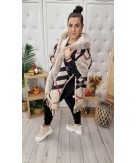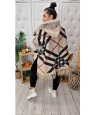Świetny model ciepłego, futerkowego poncza z kontrastowym obszyciem kołnierza, rękawów oraz kaptura.