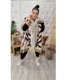 Oversizowe dzianinowe ponczo z obszyciem z lisa na kołnierzu i rękawach.